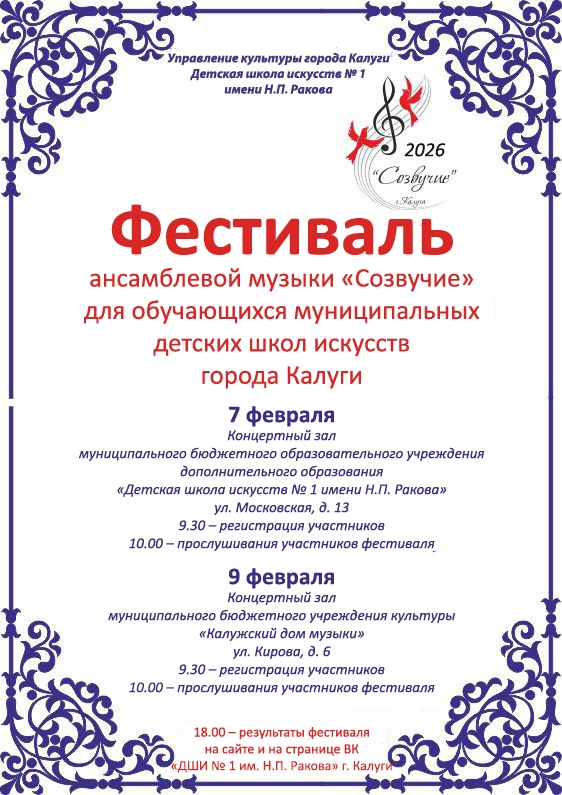 7 февраля в концертном зале Детской школы искусств №1 им. Н.П.Ракова и 9 февраля в концертном зале МБУК "Калужский дом музыки" в семнадцатый раз пройдет фестиваль ансамблевой музыки "Созвучие", объединяя каждый год большое количество ансамблей обучающихся детских школ искусств города Калуги. Желаем вдохновения и успехов всем участникам!