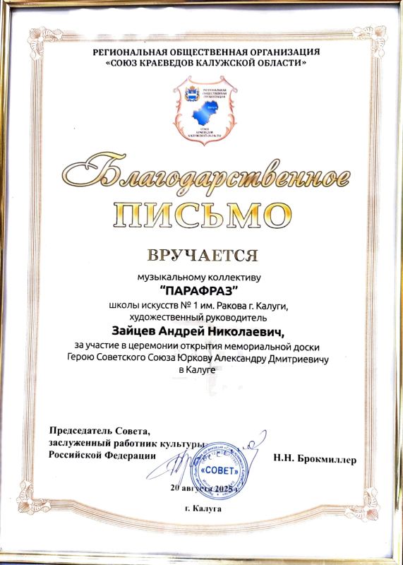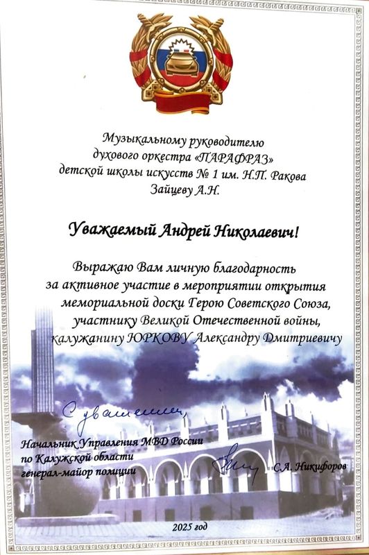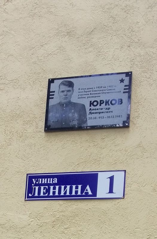 20 августа 2025 года в нашем городе состоялось торжественное мероприятие - открытие мемориальной доски калужанину Герою Советского Союза Александру Дмитриевичу Юркову. Мемориальная доска, изготовленная по проекту Алексея Олеговича Комова, была установлена на стене дома по адресу ул. Ленина, д. 1, в котором жил с семьёй А. Д. Юрков.