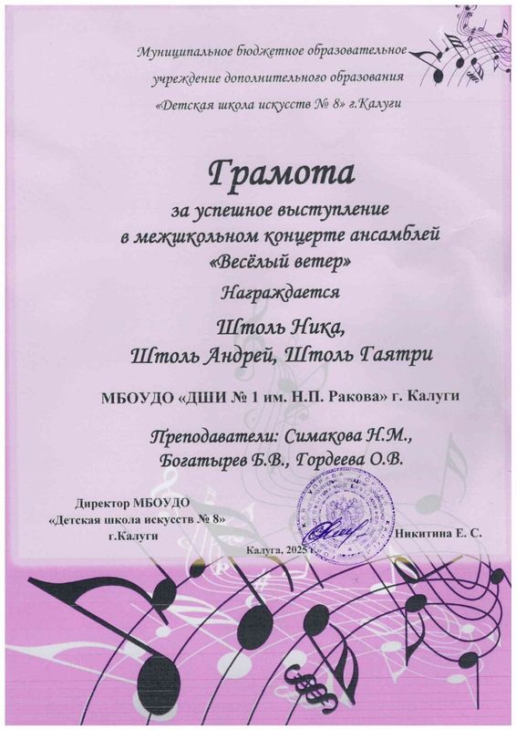 Совместное музицирование - самый интересный вид творчества, который объединяет участников, учит слушать и слышать друг друга и, в то же время, дает почувствовать ответственность и причастность к общему делу. В концерте приняли участие дуэты, трио и даже хор флейт . Прозвучала музыка современных композиторов, а также зарубежная музыка 19 века. Нашу школу представил семейный ансамбль - Штоль Ника, Гаятри и Андрей. Концерт прошел в тёплой , дружеской атмосфере, а в завершение все участники получили красочные дипломы и призы. Поздравляем всех участников с успешным выступлением и ждем новых творческих встреч!