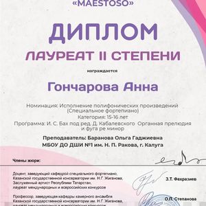 Поздравляем с успешным результатом участия в VI Международном конкурсе фортепианного искусства "MAESTOSO"