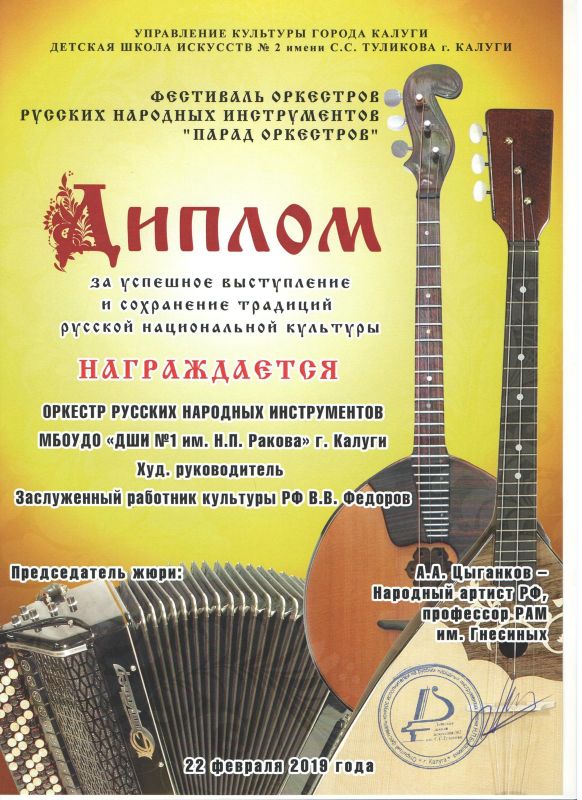 22 февраля в рамках Открытого фестиваля-конкурса исполнителей на русских народных инструментах им. Н.П.Будашкина в концертном зале ДШИ №2 им. С.С.Туликова состоялся "Парад оркестров", в котором участие принял и наш Оркестр русских народных инструментов под управлением Вадима Владимировича Федорова. Коллективу выпала честь завершить фестиваль и организаторы не ошиблись в своем выборе. Оркестр в очередной раз порадовал слушателей своим мастерством и интересным репертуаром, получив продолжительные аплодисменты и благодарность от Народного артиста РФ, профессора РАМ им. Гнесиных Алескандра Андреевича Цыганкова. Коллектив и солисты оркестра Артем Чебаксаров и Сергей Калюжный были награждены дипломами за успешное выступление и сохранение традиций русской национальной культуры.