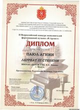 Детскую школу искусств №1 им. Н.П. Ракова в Туле представляли 4 пианиста, уже неоднократно становившиеся лауреатами конкурсов разного уровня: Бадмаев Денис, Мокану Ольга, Паюл Агния, Шавель София. И хотя волнение было очень сильным, юные музыканты сумели его побороть и блеснуть исполнительским мастерством. Их старания были высоко оценены компетентным жюри, председателем которого был Народный артист России, профессор кафедры специального фортепиано Московской Государственной консерватории им. П.И. Чайковского Ю.С. Слесарев. Результаты конкурса таковы: Паюл Агния (преп. Радошнова Н.С.) стала Лауреатом III степени, а Бадмаев Денис (преподаватель Жвынчикова Т.Н.) и Мокану Ольга (преп. Повереннова И.В.)удостоены дипломов Лауреатов II степени.