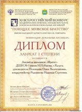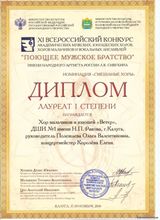 Среди 500 участников нынешнего конкурса Детскую школу искусств №1 имени Н.П.Ракова г.Калуги и наш город 18 ноября представили 3 коллектива под руководством Полежаевой Ольги Валентиновны, концертмейстеры Радошнова Надежда Сергеевна и Королева Елена Ивановна. Их исполнение было высоко оценено профессиональным жюри и заслуженно присуждены звания Лауреатов I степени в номинации «Смешанные хоры» капелле мальчиков и юношей «Ветер» и в номинации «Вокальный ансамбль» ансамбль «Фрегат», а также Лауреатом II степени стал ансамбль «Надежда». Руководитель Ольга Валентиновна Полежаева награждена «Специальным дипломом имени народного артиста России Л.К.Сивухина».