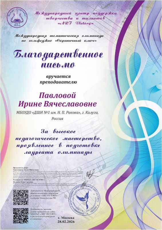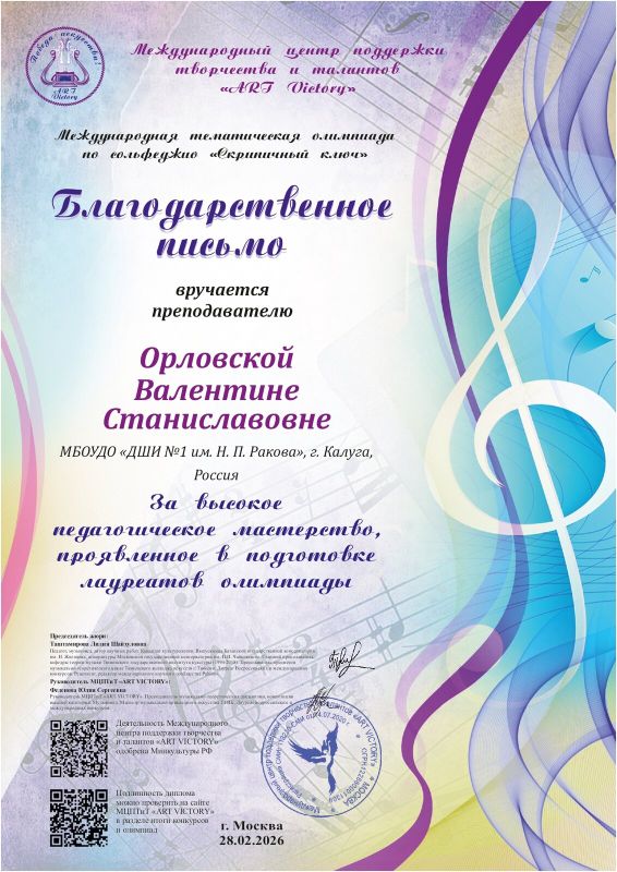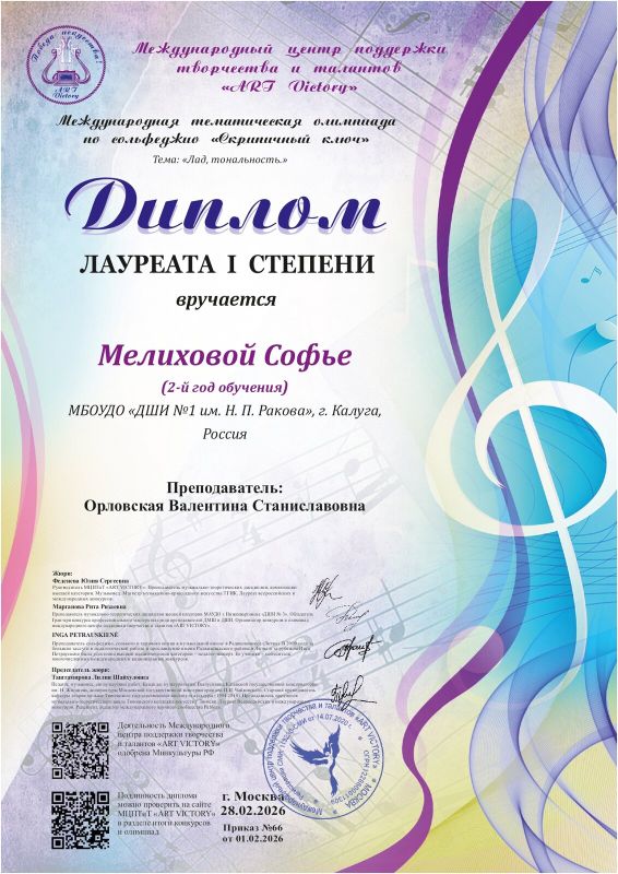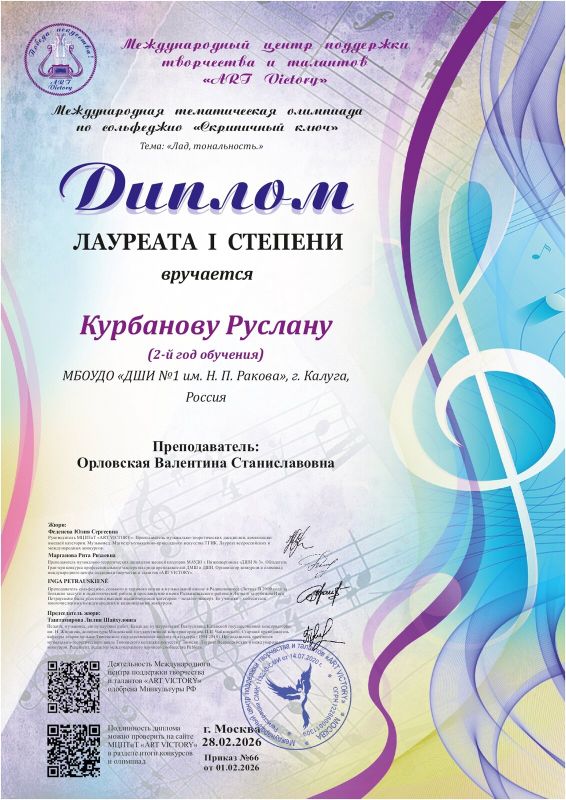 Поздравляем с отличными результатами участия в Международной тематической олимпиаде по сольфеджио "Скрипичный ключ" Руслана Курбанова, Софью Мелихову, Викторию Саргсян и преподавателей Валентину Станиславовну Орловскую и Ирину Вячеславовну Павлову!